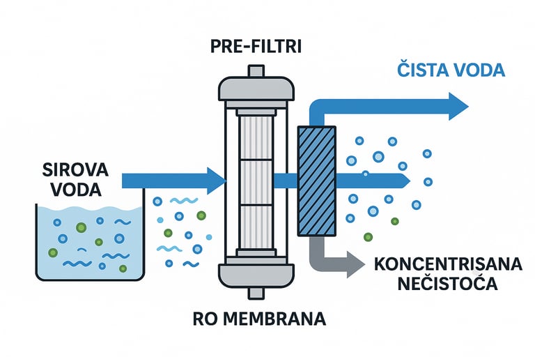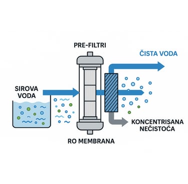 Reverzna osmoza je napredan postupak pročišćavanja vode koji omogućava da se dobije gotovo potpuno čista i sigurna voda za piće. Voda prolazi kroz polupropusnu membranu koja zadržava bakterije, viruse, soli i druge štetne materije, dok propušta samo molekule čiste vode. Na taj način osigurava se zdravlje ljudi i pouzdan pristup kvalitetnoj vodi.